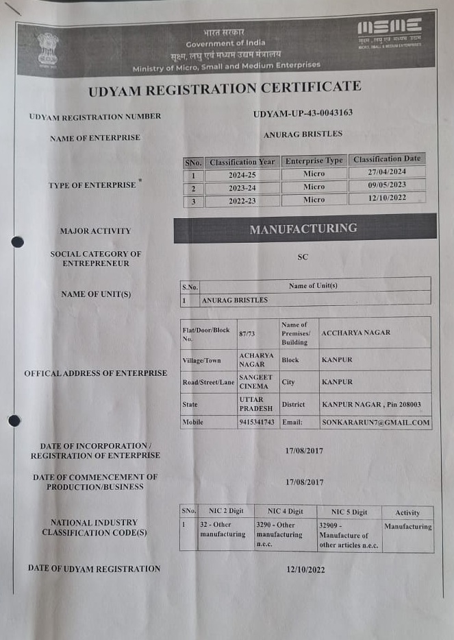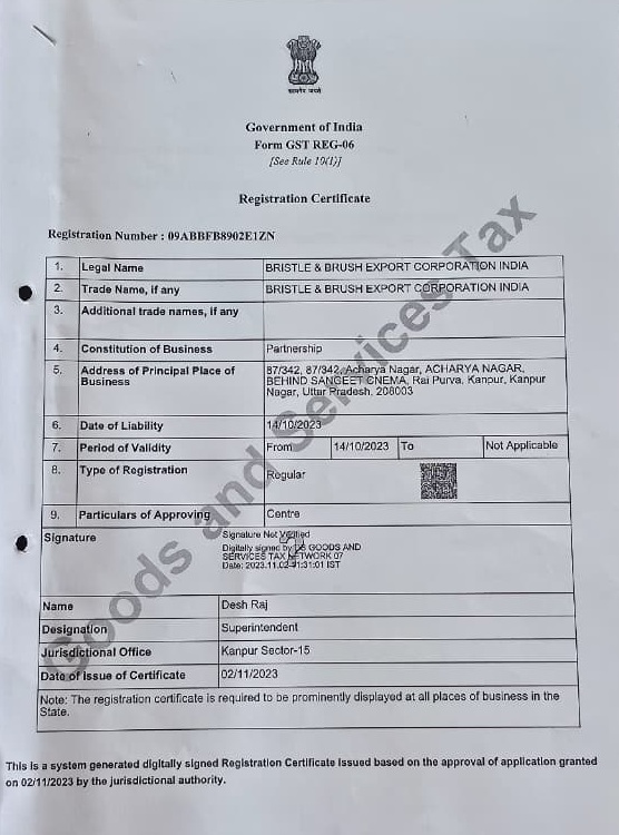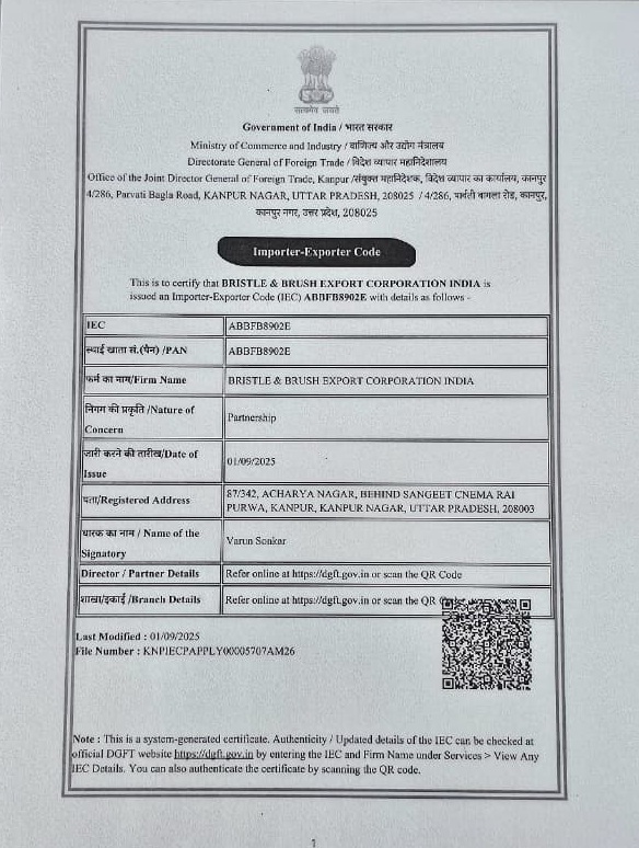 At Bristle Brush, we take pride in maintaining complete transparency and compliance with both national and international trade standards. Our certifications and legal documents reflect the authenticity, quality, and credibility of our bristle products in global markets. Key documents include the GST Certificate, ICE Certificate, and Trademark Certificate, each ensuring that our operations align with recognized business and regulatory frameworks.